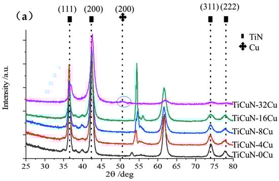 Figure 4a shows the XRD of the prepared film. It can be seen from the XRD that when the Cu content was between 1.09 at% and 4.1 at%, the Cu-related peak was not observed and no new peak appeared in the XRD, indicating that the film still had a TiN crystal structure. When the Cu content was 11.08 at% (TiCuN-32Cu), the diffraction peak of Cu (200) appeared in the XRD, indicating that a small amount of Cu nanocrystals appeared in the film. It can be seen from Table 3 that with the increase in Cu content, the half peak widths of TiN (111) and TiN (200) peaks increase. According to Scherrer’s formula [30], the larger the full width at half maximum, the smaller the grain size. Therefore, the grain size of the TiCuN film decreased with an increase in Cu content.