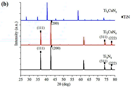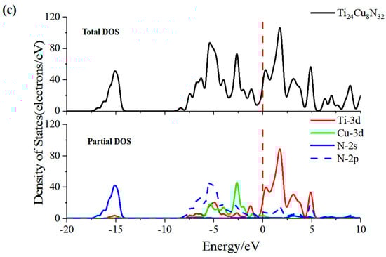 In Equation (2), Etot is the total energy of the doped model as shown in Figure 2b,c, and Esolid(Ti), Esolid(Cu), and EN(N) represent the ground state energies of single Ti, Cu, and N atoms in the crystal cell, respectively. In addition, a, b, and c represent the number of atoms of Ti, Cu, and N in the doping system, respectively. The calculated results showed that the formation energies of Cu substitutions for Ti and N were both negative (−2.08 eV and −1.38 eV, respectively), indicating that the substitutions were theoretically possible. However, the occupation energy calculated using Equation (2) was negative (−0.7 eV). According to thermodynamic theory [34], the substitution of Cu for Ti sites is easier to achieve in practice. To verify this result, the XRD of three models, shown in Figure 2a–c, were simulated using Vesta software. The results are shown in Figure 4b.