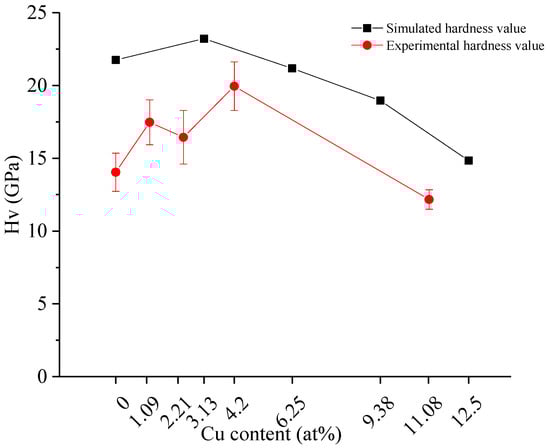 Using the results of B, G, and Chen’s formula [37], the theoretical hardness Hv was calculated. The results are shown in Figure 5. It can be seen from the figure that although the simulation results of hardness are different from the experimental results, there is a common trend that with the increase in Cu content, the hardness of the doped system first increases slightly, and then decreases.