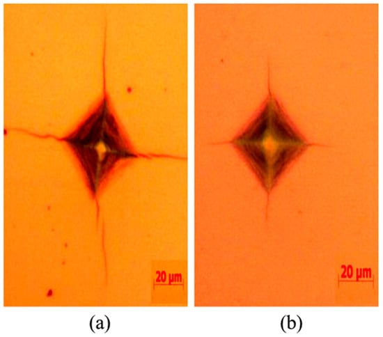 Typical microindentation morphology of (a) TiCuN-0Cu; and (b) TiCuN-16Cu.