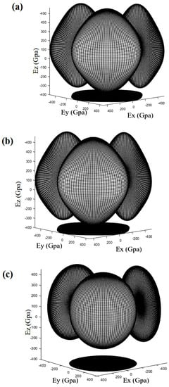 Typical 3D Young’s modulus diagram of (a) Ti32N32; (b) Ti30Cu2N32; and (c) Ti24Cu8N32.