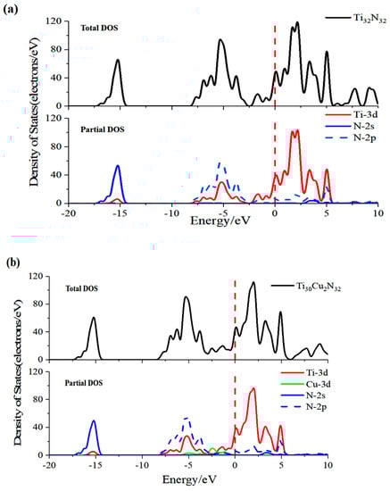 The calculated formation energy and binding energy of the doped structures are shown in Figure 7. As shown in Figure 7a, the formation energies of all Cu doped TiN systems are negative, indicating that these systems can be prepared under certain experimental conditions. However, with an increase in Cu content, the absolute value of the system formation energy decreases, indicating that the increase in Cu content decreases the structure stability of TiN. It was found in the experiment that when the Cu content exceeded 11.08 at%, there was a single crystal phase of Cu in the coating [23]. It is simply the instability of the doping system that caused the precipitation of Cu. It can be observed from Figure 7b that with an increase in Cu content, the binding energy (absolute value) of the doping system decreases, indicating that Cu doping will cause a change in TiN bonding state, resulting in the decrease in average bonding strength, which can be confirmed by conducting density of states and Mulliken population analysis.