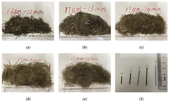 The five lengths of basalt fiber: (a) L = 12 mm; (b) L = 18 mm; (c) L = 24 mm; (d) L = 30 mm; and (e) L = 36 mm; and (f) a schematic diagram of the different fiber lengths.