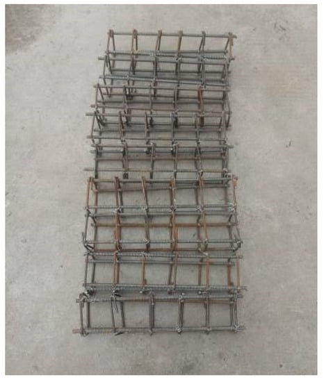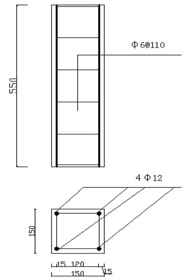 The analysis results of optimal design parameters in the previous section show that the optimal fiber length is 12–24 mm and the fiber volume content is 0.15%. As a result, in the subsequent experiments, only two fiber lengths of 12 mm and 18 mm, as well as fiber volume of 0.15%, are selected for the short column design. Here, a total of nine reinforced concrete short columns numbered S1–S9 are designed. Among them, the samples numbered S1–S3 are ordinary reinforced concrete short columns, and the samples numbered S4–S6 and S7–S9 are the BRFC short columns with fiber length of 12 mm and 18 mm, respectively. For all the BRFC short columns, the fiber volume content is selected as 0.15%, as previously described. The short column is featured with a cross-section size of width × height = 150 mm × 150 mm, and a slenderness ratio of 3.67 (length/width = 550/150 = 3.67), which is less than 8. The concrete cover is 10 mm. All short columns are arranged with four HRB400 threaded bars with a diameter of 12 mm as longitudinal reinforcement, and the stirrups are made of HRB335 plain round bars with a diameter of 6 mm and a spacing of 110 mm. The reinforcement configuration is provided in Figure 4 and Figure 5. As required by GT/B 288.1-2010 [25], the yield and tensile strength of the two kinds of reinforcement are 486 MPa versus 360.1 MPa, and 590 MPa versus 570.4 MPa, respectively. Preloading is required before formal loading. Each short column is preloaded with 100 kN for 5 min to observe the reliability of the loading system and each measuring point. The formal loading is performed by the grading loading system. The loading of each stage is 50 kN, which is maintained for 2 min. When cracks or bulges appear, the loading is increased to 10 kN until the short column is damaged.