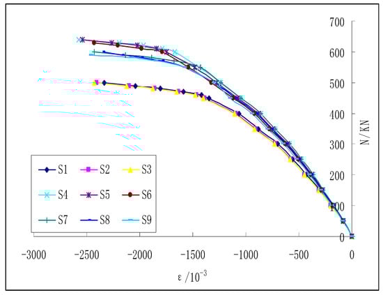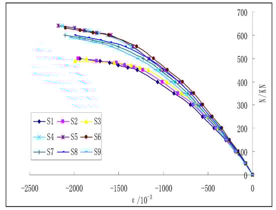 The average value of the measured strain of the concrete and steel bar at the midpoint of each column is plotted in Figure 7 and Figure 8. As indicated, the short columns are basically in the elastic stage at the beginning of loading and then enter the elastic–plastic stage with the increase of load. The concrete strain of the S1–S3 short columns reaches its peak around 0.0019, compared to a peak of around 0.0021 for the S4–S6 short columns. For the S7–S9 short columns, the peak value is about 0.0023. In addition to a slightly larger steel strain at peak value, the slope of the N-ε curve of the BRFC short columns in the elastic stage is also greater than that of the reinforced concrete short column.