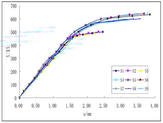Figure 9 shows the variation law of the vertical displacement at the top of each test short column. As indicated, the vertical displacement of the short column exhibits an obvious plastic stage with the increase of the load. The vertical displacement of the BRFC short columns is significantly greater than that of the ordinary RC short columns. More specifically, the vertical displacement of S4–S6 is the largest, followed by S7–S9, and is the smallest in S1–S3. Due to the restraint of fiber, the BFRC short column has greater displacement when the load reaches the peak value. From the elastic stage to elastic–plastic stage, the load displacement curve of the BRFC short columns is smoother and the plastic characteristics are obvious.