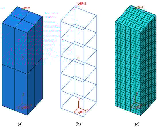 The finite element model of the short column: (a) the entity model; (b) the reinforcing element; and (c) the concrete unit.