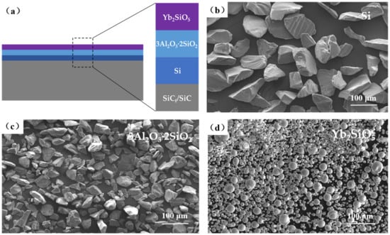 Preparation of the EBC by the PS-PVD thermal spraying process. (a) Schematic diagram of the EBC structure. SEM images of each coating powder in the EBC: (b) Si; (c) 3Al2O3 2SiO2; and (d) Yb2SiO5.