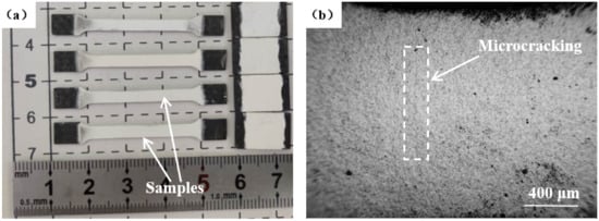 Matrix materials (SiCf/SiC CMCs) are a kind of continuous SiC fiber-toughened SiC ceramic matrix composite. Si/3Al2O3·2SiO2/Yb2SiO5 three-layer environmental barrier composite coatings good resistance to high-temperature oxidation and water oxygen corrosion. To study the effects of temperature and load under high-temperature tensile conditions, the substrate sample was experimentally processed into a rectangular specimen measuring 40 × 3 × 2 mm3, and the EBC was then sprayed using the spraying parameters in Table 1. The sample after spraying is shown in Figure 2a. Samples presented with microcracks on the surface after spraying (Figure 2b), thus further observations were carried out to understand the propagation and failure behavior of the surface microcracks when subjected to different temperatures and loads.