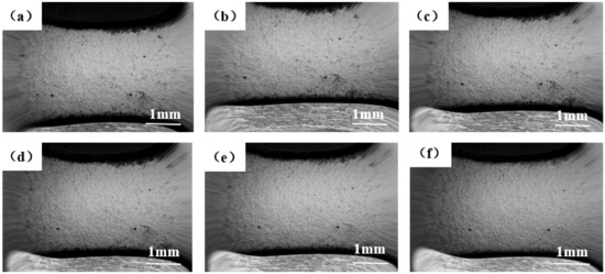 When magnification was increased, microcracks on the surface of the coated specimens were observed in situ. The same temperature series as above was selected for the microscopic in situ observation of the specimens. Figure 4 depicts the in situ microscopic morphology of the specimens at temperatures of 111 °C, 213 °C, 323 °C, 430 °C, 528 °C and 766 °C. Even at higher magnification, no crack extension behavior was observed, suggesting that the temperature increase did not lead to microcrack extension and elongation and that the effect of temperature change on cracking was limited under the condition of simply increasing the temperature without the addition of a tensile load.