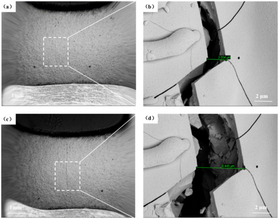 As the in situ imaging magnification was increased, microcrack propagation was clearly observed on the coated sample surfaces when subjected to tensile loading at the high temperature of 766 °C. As shown in Figure 7, the microcracks gradually widened with the application of increasing the load to the coatings. In Figure 8, the width of the crack on the coating surface increased from 3.55 µm to 5.89 µm, indicating that the loading force had a significant effect on crack propagation and the fracture failure of the sample at 766 °C.