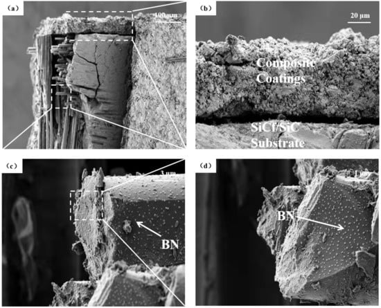 In situ SEM reveals microscopic features of the fracture developed under a load of 340 N in a sample held at 766 °C: (a) fracture micromorphology; (b) local magnification of fracture micromorphology; (c) local magnification of fractured matrix; and (d) local magnification of coating portion of fracture.
