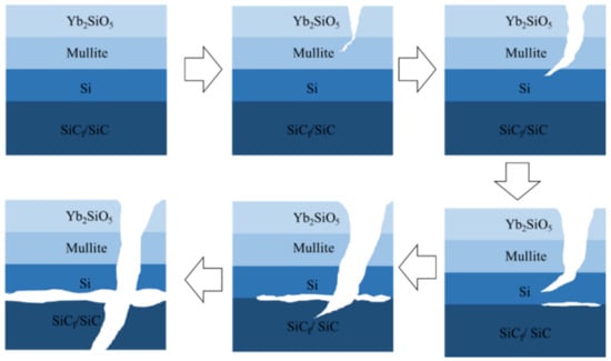 Figure 11 is a schematic diagram of the fracture mechanism of the sample. The failure mechanism of the coating is divided into two parts: the fracture and spalling of the coating caused by a penetrating crack that develops on the face, followed by interlayer crack fusion due to the penetrating of the crack through subsequent layers. After the EBC is coupled with high temperature, the sharp temperature difference leads to microcracks on the surface and the formation of microcracks at the coating interface. After a period of time, the cracks extend to the interface of the coating, with the two crack types meeting and fusing with each other, which intensifies the damage to the SiCf/SiC substrate and finally leads to substrate rupture.