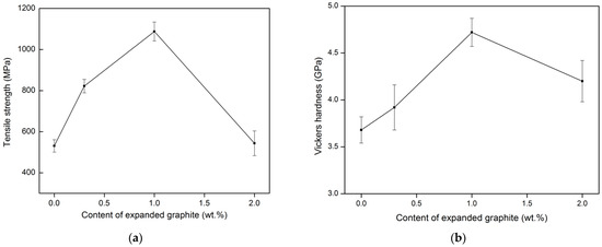 (a) Tensile strength and (b) Vickers hardness as a function of expanded graphite content.