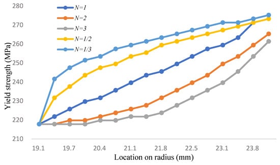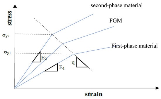 where and represent the stresses and strains on every region of a two-phase FGM with various volume fractions of and , this model can determine the yield strength of FGMs as given in Equation (1), such as elastic modulus and thermal expansion coefficient,
