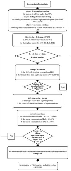 This study evaluates the structure of nuclear coolant pipes made with FGC and FGM. The traditional FGC structure is made with T91/F91 ferritic-martensitic alloys [7,8]; the LBE liquid is the cooling source for nuclear power [9]. The FGC structure is a component of Fe-Cr-Si solid solutions and ferritic-martensitic alloys like T91/F91. As high strength is required for pipe structures, ferritic-martensitic alloys are the substrate metal of the model when Fe-Cr-Si solid solution is used as the surface corrosion-resisting coating [7,8,9,10,11]. Currently, the working environment temperature of light water reactor (LWR) is about 250 to 700 °C [7,8,9,11]; the LBE in nuclear coolant pipe is about 250 to 500 °C [12,13]. The Large-Break Loss-of-Coolant Accident (LBLOCA) is considered the worst scenario of nuclear power failure, the temperature could rise to 1200 °C when this accident happened and make the cladding wall fatigue failure [14,15,16]. Due to the high temperature condition of nuclear power plant, the consideration for thermal stress measurement and corrosion testing is necessary [17,18,19,20]. However, the structure for the coolant pipe is constructed with the Fe-Cr-Si solid solution coating welded on the T91 substrate metal with a thickness of 17~80 μm [7,8,9]. This composition might make the stress much higher on welding than other places and the silicon concentration lower than 1.25 wt.% because of the large difference of concentration distribution between T91 alloys and Fe-12Cr-2Si. FGM might be an improvement for both strength and corrosion resistance.