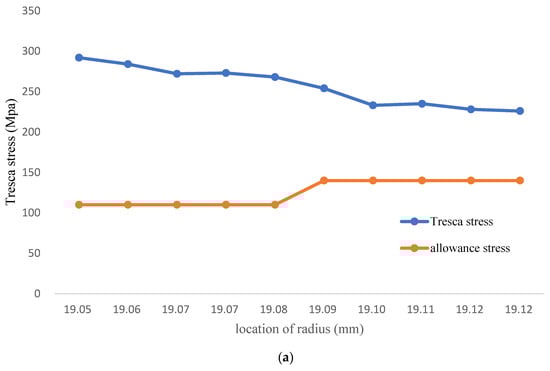 Since (, , ) are the primary principal stresses, the maximum shear stress theory is depicted by Equation (14),