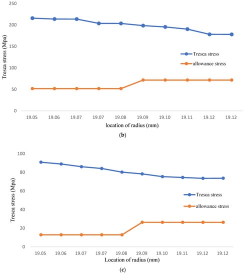 When the environment temperature rises to 1000 °C, the allowance stress becomes lower because the yield strength declined. However, the tresca stress on the inner wall is higher than four times of allowance stress as shown in Figure 5b and Table 4. The tresca stress will be higher than yield strength which makes the coolant pipe model into plastic deformation. When the temperature is 1200 °C, the allowance stress is range from 12.9~26.30 Mpa; even though the tresca stress is reduced comparatively. The tresca stress is higher than yield strength and make the coolant pipe model into plastic deformation, as shown in Figure 5c and Table 5. All the results indicate the FGC structure applied on coolant pipe are at the risk of plastic deformation and fracture occurs.