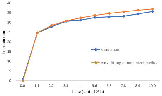 Fick’s law in Equation (38) is used in the diffusion analysis of silicon concentration. 1.25 wt.% is standard for the corrosion resistance of the inner wall; the distance between the location of 1.25 wt.% and the inner wall is shown in Figure 6 and Table 6; the figure illustrates the location-time relation of the diffusion when the temperature environment is 700 °C. The simulation result is compared with the curve fitting made by analyzing the diffusion of T91/F91 in the semi-infinite region [7], which is shown as Equation (34). The simulation shows that the 1.25 wt.% concentration arrives at the 34 µm location after 6.7 × 105 h, meaning the corrosion resistance of Fe-12Cr-2Si on the T91/F91 circular model lasts for about 60 years. The simulation process has considered the LBE diffusion boundary; therefore, the result is more accurate than the curve fitting condition.