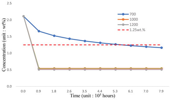 As shown in Figure 6, the Fe-12Cr-2Si coating has no corrosion resistance after 6.7 × 105 h; the concentration of the inner wall is evaluated at 700, 1000, and 1200 °C, respectively in Figure 7 and Table 7. The diffusion under the 700 °C environment is the same as in Figure 6. However, the concentration of the FGC structure drops drastically before the end of 9 × 104 h when the temperature is higher than 1000 °C. Therefore, the FGC structure should be optimized because of the strength design and the corrosion problems.