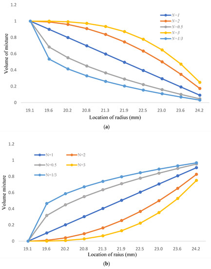 (a) The volume mixture of Fe-12Cr-2Si for two-phase FGM; (b) The volume mixture of T91 for two-phase FGM.