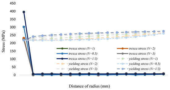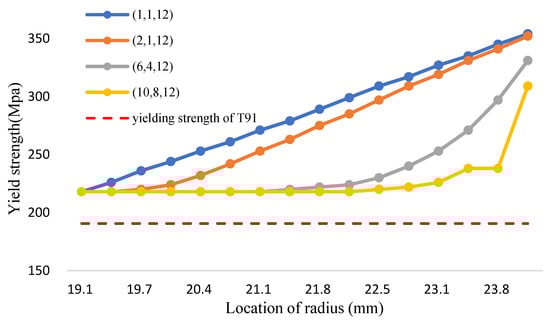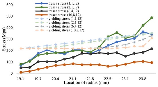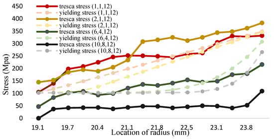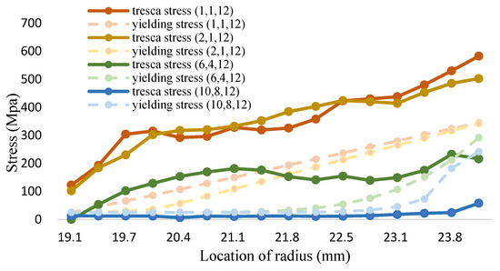 The maximum shear stress value of 1000 °C is shown in Figure 18 and Table 20. It can be seen from the figure that the tresca stress distribution of Fe-12Cr-2Si and TiO2 presents a linear distribution for the (1,1,12). The stress is higher than yield strength. However, the distribution of the maximum shear stress value decreases with the increment of the volume fraction value. When the volume fraction values of Fe-12Cr-2Si and TiO2 are 10 and 8 respectively, the maximum shear stress can also be reduced to less than the allowable stress, that is, less than half of the yield strength. The results are consistent with those in the environment of 700 °C. When the volume integration rate increases, the maximum shear stress can be effectively reduced.