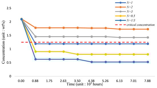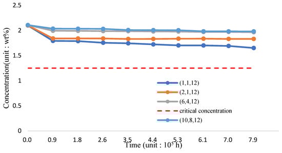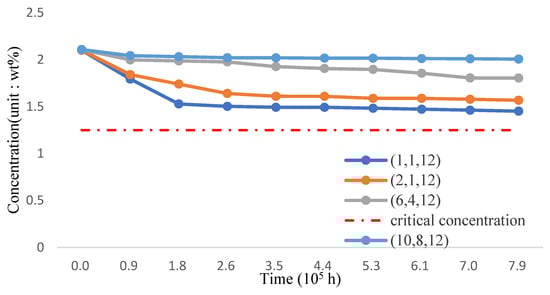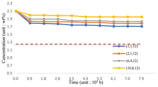 The variation of silicon concentration on the surface of the three-phase FGM pipe wall in the 1200 °C-working environment is shown in Figure 22 and Table 24. Per the analysis results, incorporating TiO2 and reducing the proportion of T91 material can still effectively improve the maintenance of surface silicon concentration. If the proportion of the Fe-12Cr-2Si-TiO2-T91 body integral rate is maintained (10,8,12) for 8.8 × 105 h, the silicon concentration can approach 2.0190 wt.% stably.