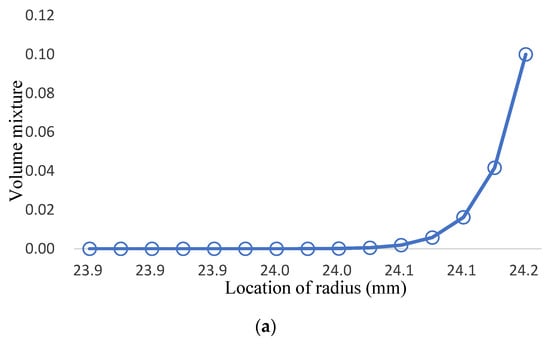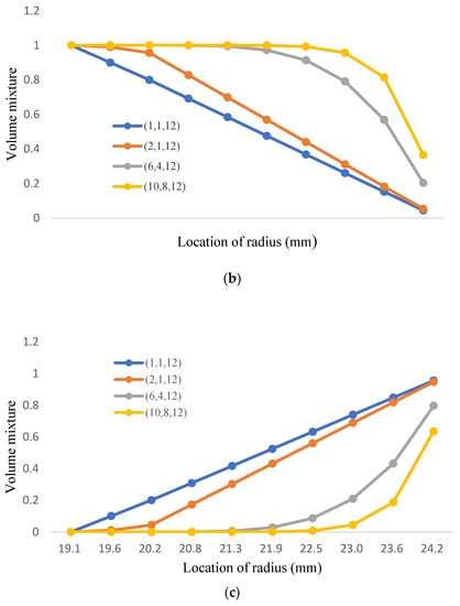 The volume mixture of Fe-12Cr-2Si is presented in Figure 8a and Table 8. The ratio of Fe-12Cr-2Si decreases gradually and turns into T91 alloys; the volume mixture of T91 alloys is shown in Figure 8b and Table 9, the distribution of the two-phase model is influenced by the variation of volume fraction number from Fe-12Cr-2Si. The volume mixture of T91 is one minus the fraction number of Fe-12Cr-2Si.