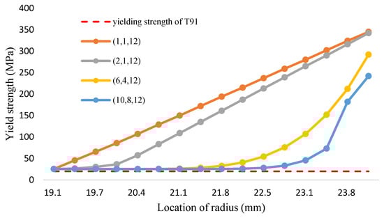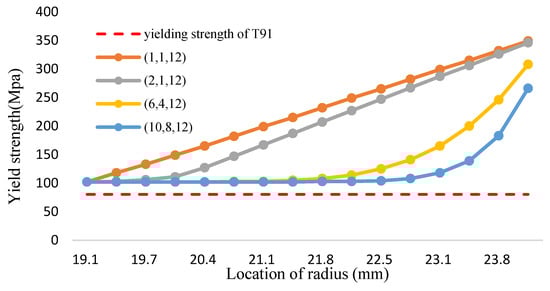 In this study, the FGC coolant pipe is created by welding Fe-12Cr-2Si solid solutions with a thickness of 34 μm on the T91/F91 circular structure; the margin of safety for the FGC analysis should be higher than 98%. However, Figure 5a and Table 3 shows that when dividing the yield strength between the layer of 0 and 80 μm close to the inner wall of the coolant pipe by 98% in a 700 °C environment, the tresca stress distribution is significantly higher than the allowance stress. Especially the tresca stress of the inner wall, which is higher than twice of the allowance stress.