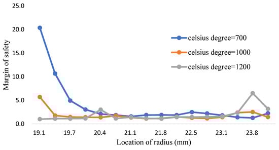 From the Figure 17, Figure 18 and Figure 19, it can be clearly seen that all the volume mixture model (10,8,12) can reach the Tresca stress is lower than the yield strength and the allowance strength at different temperature. The margin of safety in this research can be evaluated by Equation (13), the allowable strength is the tresca stress from the volume mixture (10,8,12). These distributions can be depicted in the Figure 23 and Table 25, from the 700 to 1000 °C the safety margin of inner wall is much higher than other place because the Tresca stress closing to the inner wall is very small. When the temperature is higher, both the Fe-12Cr-2Si and T91 alloy have a lower yield strength. It makes the safety margin of 1200 °C reduced in front of the inner wall of coolant pipes. However, thanks to the high yield strength of titanium dioxide, the safety margin closed to the outer wall increases gradually.