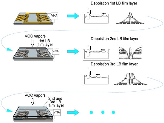 In the LB film deposition process, a single monolayer of biphylic water insoluble molecules is spread at the air–water interface of a LB trough []. After the solvent evaporation is complete, a compression of the monolayers starts and the 2D phase diagram of the substance is recorded. At every point of the phase diagram, compression can be terminated and the hydrophilic substrate to be coated (the QSM in this case) is withdrawn vertically at a constant speed until a quality monolayer of the LB substance builds up onto its surface (Figure 1). Each layer has the same thickness if the deposition conditions are kept constant, as was our case []. The process can also be repeated with substrate insertion and withdrawal from the air–water interface. In this case, a bilayer is deposited. For the SLP device, this process is performed only once. The reason for this is the well-known fact that quality phospholipid LB films can be deposited only as single layers. Subsequent coating of the same SLP layer on top of the first one is no longer stable and peels off []. After each monolayer (or bilayer) deposition, the coated device is evaluated by recording its frequency and the group delay responses using a VNA and its sensitivity to saturated vapors of chloroform, hexane, methanol, acetone, ethanol, and water is measured.