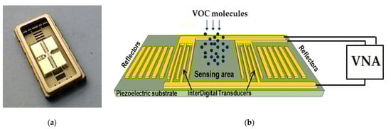According to [], any organic compound that has a boiling point less than or equal to 250 deg. C at room temperature and standard atmospheric pressure of 101.3 kPa is considered as a VOC. Furthermore, VOCs are inert, highly dilute and volatile, and their sticking affinity to various types of surfaces is low, which makes their detection quite problematic. Currently, the most precise and commonly used VOC detection methods are gas chromatography [], frequently used in combination with mass spectroscopy (MS) []. Some modifications of these techniques such as the addition of a time-of-flight analyzer, selected ion flow tube-MS, proton transfer reaction, and ion-molecule reaction-MS further enhance their performance []. These techniques are very reliable and provide highly accurate data. However, they use very expensive equipment, need trained personnel, feature a long processing time, and are mainly limited to laboratory conditions. An alternative approach that can be utilized for field measurements and real-time monitoring is the electronic nose (e-nose) approach, which uses an array of sensors, each specific to a given gas [,,]. These sensors typically use optical, electric [], and gravimetric transduction techniques []. The gravimetric method, also the subject of this paper, is typically realized with acoustic wave based transducers using various bulk acoustic wave (BAW) and surface acoustic wave (SAW) modes as well as mechanical vibration modes. Typical representatives of these three types of gravimetric sensors are the BAW-based quartz crystal microbalance (QCM), the film-bulk acoustic resonator (FBAR), SAW-based delay lines, filters and resonators, and micro electro-mechanical system (MEMS) devices such as cantilevers []. All of these transducers are mass sensitive. Any mass attached to their active surface results in a change in the acoustic or mechanical wave propagation velocity, causing a measurable group delay and phase change, accordingly. These mass proportional phase changes can be precisely measured either directly, by means of a vector network analyzer (VNA), or using a simple feedback loop oscillator circuit stabilized with an acoustic or mechanical transducer where a phase shift results in a mass proportional frequency change that can be easily measured at a high resolution using a simple frequency counter [].