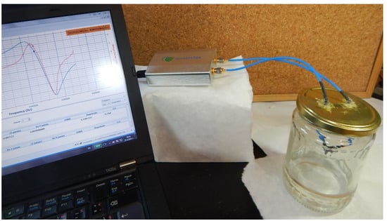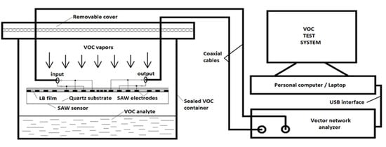 The gas probing setup schematic is shown in Figure 3 and an image is shown in Figure 4. The coated QSM was placed in a hermetically sealed container with some liquid-phase VOCs inside. Typically less than 1 min of time is enough for the saturated vapor pressure to settle down until the thermodynamic equilibrium of the saturated VOC vapors is reached inside the container. The return to the baseline frequency can also be achieved within seconds with some exceptions (chloroform) where several percent from the frequency shift required a longer time for recovery. From the VOC exposure to subsequent VOC exposure to the same gas, the results were very reproducible. Some aging over time (months scale) for the AA LB films was noticed, as previously described []. The QSM’s frequency and group delay responses were recorded prior to and after placing the sensor inside the container. The difference in resonance frequency between these two readings was the VOC vapor mass sensitivity and the difference in loaded Q, and the insertion loss showed how the vapor load affected the electrical QSM performance. A laptop controlled VNA (PocketVNA, Rohrdorf, Germany) connected to the QSM via semi-rigid coaxial cables through the container lid was used to record the measurement data.
