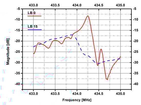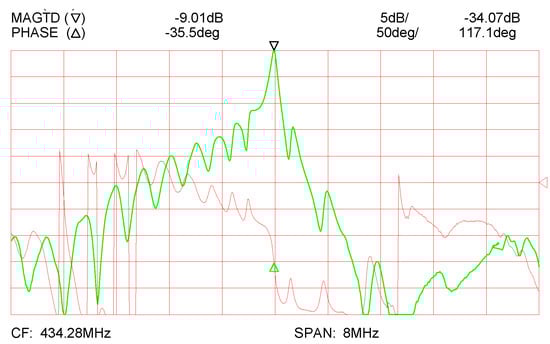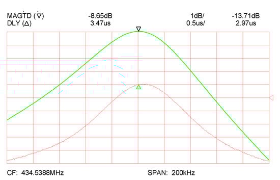 The main reasons as to why we decided to use the TPR from Figure 5 and Figure 6 in this study is because of its low insertion loss (less than 9 dB, see Figure 6), its excellent thermal stability, which is within 10 ppm over a thermal span of ±20 K at room temperature (not shown here), and its very high loaded Q-factor, which is the key to obtaining a low LOD. As shown in [], when connected to a sensor oscillator circuit, such a TPR can provide a short-term stability of a few parts in 10exp(−10)/s, which results in LOD levels in the pg and even fg range []. According to [], the loaded Q of the device from Figure 5 can be calculated from its narrowband group delay reading τg, measured with a VNA (Anritsu MS 620J, Japan), as shown in Figure 5. With τg = 3.47 µs at the resonance frequency fo = 434.539 MHz and using the formula []: