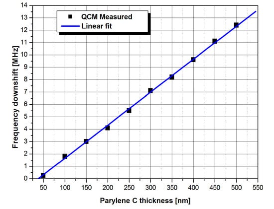 In order to obtain accurate readings for the mass deposited on the surface of the QSM, it first needs to be mass calibrated. This is conducted by depositing a thin uniform layer of a substance with a known density ρ whose thickness was precisely measured by a classical QCM used as a thickness meter in the process of deposition. In this case, we used a polymer called Parylene C with ρ = 1.289 g/cm3 deposited at room temperature in a well-controlled coating process using a plasma enhanced chemical vapor deposition (PECVD) reactor []. The mass calibration curve obtained in this way is shown in Figure 7. It is linear and its slope is the thickness sensitivity factor Ts = 25 kHz/nm. From this value, the mass sensitivity Ms of the QSM is derived by using the following relationship []: