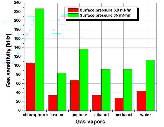 The influence of the DPPE-NBD LB-film surface pressure on the mass sensitivity of the SLP device to the 5 VOCs tested is shown in Figure 9. It is clearly evident that the surface pressure, responsible for the density of the LB molecules and the film quality on the QSM, provides up to twice as high a mass sensitivity at 35 mN/m compared to the much lower 3.8 mN/m value. This suggests that careful surface pressure optimization is required for the maximum mass sensitivity, which reached 230 kHz (530 ppm) for chloroform with this surface pressure optimized device. We found that the frequency downshift after the monolayer deposition was less than 200 kHz, suggesting that the mass of the sensing DPPE-NBD monolayer was less than the amount of chloroform mass it could absorb. Such a phenomenon is rarely observed with gravimetric gas sensors and is further proof of the potential of SLP coated QSM devices for sensor applications. For comparison, classical 10 MHz QCM devices had around only a 40 Hz shift (4 ppm) for a 40 layer AA LB film for VOCs of similar concentration [].