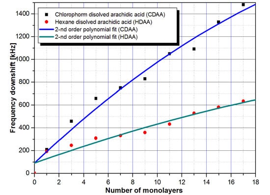 An integral part of the mass sensor is the sensing layer, which is firmly attached to the transducer and is responsible for capturing a certain amount of mass of the chemical or biological substance of interest. On one hand, the sensing layer determines the affinity of the measured substance to the sensor’s surface, thus providing the desired mass sensitivity and selectivity. On the other hand, it also determines the sensor’s limit of detection (LOD) []. Commonly used sensing layer materials are metal oxide nanostructures; carbon nanotubes and nanohybrids; pristine polymers and molecularly imprinted polymers as well as supramolecular structures [,]. The sensitivity and reproducibility of the sensor parameters rely on a well-controlled monolayer deposition and a smooth and uniform sensor layer surface. Usually, the more uniform the surface layer, the higher its sensitivity [,]. Dip or sputter-coating and evaporation methods do not provide sensing layers of sufficiently high quality. Alternatively, self-assembly and layer-by-layer deposition techniques do produce quality films. In this respect, the degree of control provided by the Langmuir–Blodgett (LB) deposition method is unmatched [], which is why we also used it in the current study.
