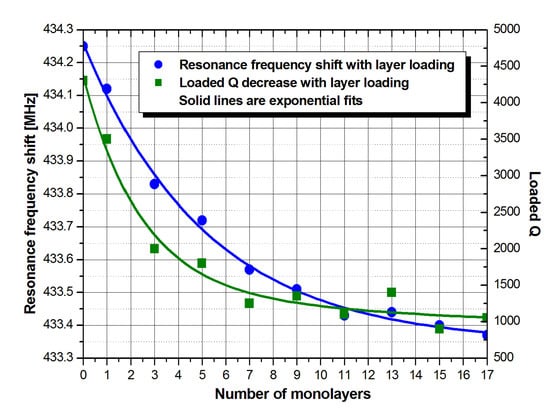 The mass loading sensitivities of the layer-by-layer LB film coated CDAA and HDAA sensors versus the number of monolayers is shown in Figure 10. The CDAA coated devices seemed to be twice as mass sensitive as the HDAA ones. We expected the data plots in Figure 10 to follow a linear dependence, as implied by Figure 7. However, we found that a second-order polynomial fit was closer to the reality. An even stronger nonlinearity is also evident in Figure 11, demonstrating an exponential behavior of the frequency shift and loaded Q with the CDAA coated device. We explained this nonlinear behavior with the fact that LB layers do not just cause regular linear mass loading such as Parylene C does, but they also decrease the penetration depth and active surface area, as explained in Section 2.6. Both effects, the second of which is nonlinear, oppose each other and cause the observed nonlinearity.
