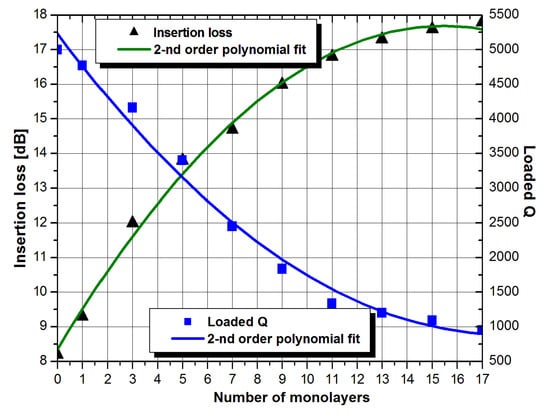 The insertion loss of the CDAA device also increased gradually with the number of monolayers, following the gradual decrease in loaded Q, as shown in Figure 12. Here, we can see that the loaded Q reached the value of 1000 when the 15th layer was deposited while the insertion loss barely reached 17.5 dB. Very similar results for the loaded Q and insertion loss were also obtained with the HDAA devices. This means that the solvent used for the AA solution preparation itself has little influence on the QSMs’ electrical behavior. However, it does affect the sensitivity to different VOCs, as will be later shown in this section.