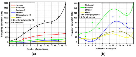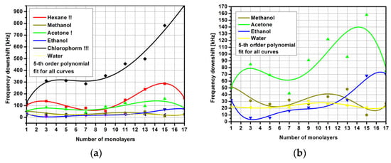 From the results in Figure 10, Figure 11 and Figure 12, we can conclude that there seems to be a quite a significant difference in the overall behavior of LB-functionalized QSMs versus the Parylene C-coated ones. According to the classification of the mass sensitive films for the SAW sensors provided in [], Parylene C behaves much more like a semisolid or solid glassy film. It provides very linear and well-behaved mass loading responses, but unfortunately zero affinity to any gas-phase compound and is therefore usable only for mass calibration purposes. LB films such as the ones we used here, behave much more like soft highly sensitive films []. They are not so well-tolerated by the QSM devices since they quickly degrade their electrical performance, but, on the other hand, they provide high sensitivities to various gases including VOCs. This is evident from the sensitivity data for the HDAA coated devices in Figure 13. The mass sensitivity to chloroform increased with the number of monolayers and reached the value of 950 kHz (2200 ppm) at the 17th layer. This resulted in a total adsorbed chloroform mass of 21.8 ng at 43.5 kHz/ng sensitivity (see Section 2.5). A lower sensitivity of about 160 kHz (370 ppm) to hexane was observed at the 15th layer while for the other three VOCs including water, the sensitivity was much lower (see Figure 11). We found that all curves demonstrated an oscillating behavior best described with a 5th-order polynomial fit. As evident from Figure 13b, the oscillations were more pronounced for the polar VOCs tested—water, methanol, and ethanol. We believe that this oscillating behavior occurs as a result of defect formation in the LB films in the process of deposition—a phenomenon that we cannot control in our coating process. As shown in [], defects in AA LB films are usually one layer or less thick and then they average over the film thickness with every subsequent layer. A different density of defects in each layer may also be the reason for the observed sensitivity oscillations from layer-to-layer in Figure 13b. This also explains the fairly large deviation of the measured data points from the fitted lines in Figure 13b and Figure 14b. Please note that defect formation in the LB films is not necessarily a bad thing since they increase the active surface area of the sensor and therefore its gas sensitivity. Artificially created defects either by the skeletonization of fatty acid LB films [] or by using a mixture of fatty acids with different chain lengths [] increased the sorption of both polar and nonpolar VOCs several times.