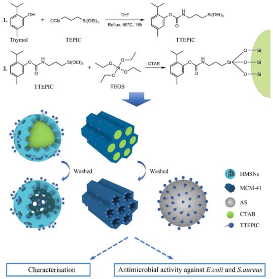- Liu, Y.; Jin, L.; Wang, C.; Sheng, J.; Song, Y. Thymol-functionalized hollow mesoporous silica spheres nanoparticles: Preparation, characterization and bactericidal activity. Bull. Mater. Sci. 2021, 44, 126. [Google Scholar] [CrossRef]