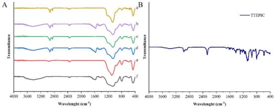 Figure 3 depicts the FT-IR spectra of the different bare, functionalized supports, and TTEPIC. In general, the different bare and functionalized supports exhibited a large and unresolved envelope located in the region 1300–1000 cm−1, and medium bands at 791 cm−1 and 460 cm−1, which are characteristic absorption bands of silica respectively assigned to the asymmetric stretching vibrations of Si-O-Si, symmetric stretching vibration of Si-OH, and symmetric stretching vibrations of Si-O [35,36,37]. The weak peaks at 2927 cm−1 and 2856 cm–1 appeared in mesoporous silica particles (Figure 3(Aa–Ad)) and can be attributed to the antisymmetric and symmetric stretching modes of CH2 in CTAB, respectively [24,35]. In addition, the presence of a broad band from 3600 to 3000 cm−1 in the functionalized particles and TTEPIC (Figure 3(Ab,Ad,Af),B) corresponded to the O-H bonding vibration of adsorbed water and N-H bonds of TTEPIC, and peaks’ range at 1600–1420 cm−1 was as-signed to the C=C stretching of the aromatic ring [36,38,39]. Unfortunately, the C-O-C vibration peak of TTEPIC was covered by the vibration of Si-O-Si, although the mentioned evidence enough confirmed the presence of TTEPIC on the surface of functionalized silica particles.