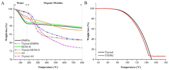 Figure 4A shows the TGA curves of bare and functionalized supports. The different bare supports showed a one-step of weight loss in the range of 30–180 °C, which can be attributed to the loss of absorbed water molecules and used solvent in the synthetic procedure. The TGA curve of functionalized particles exhibited a two-step weight loss. Compared with bare particles, the preliminary stage before 180 °C showed less weight loss. During the next stage (200–800 °C), the weight loss was attributed to the decomposition of the organic moiety on the surface of the supports, which proved thymol was successfully grafted on the surface of silica particles. Meanwhile, these results showed that the amount of thymol grafted on the surface of different supports was about 7.11% (HMSNs), 7.36% (MCM-41), and 10.39% (AS), respectively. In addition, thymol was completely degraded before 150 °C shown in Figure 4B, which indicated that functionalization effectively improved the stability of thymol. Similarly, the organic moiety of TTEPIC is also rapidly degraded during 30–150 °C.