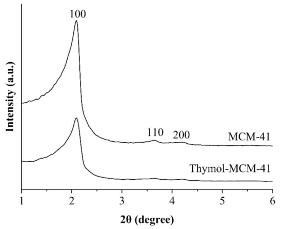 In Figure 5, small-angle X-ray diffraction (XRD) patterns of the host matrix MCM-41 and the functional antibacterial support are shown. It can be seen that MCM-41 exhibited characteristic diffraction peaks at 2θ = 2.09°, 3.64°, and 4.18°, ascribable to the (100), (110), and (200) atomic planes associated with two-dimensional cylindrical pores arranged in p6 mm hexagonal symmetry [40,41], representing a typical MCM-41 XRD pattern. Compared to MCM-41, the diffraction intensities of Thymol-MCM-41 is 2.09°, implying that the main structure of mesoporous silica was not altered. However, Thymol-MCM-41 exhibited no obvious characteristic peak at 3.64° and 4.18°, suggesting that thymol was well introduced on the surface of mesoporous silica, and the characteristic peak cannot be detected by X-ray because the electrostatic coating of thymol slightly reduced the order of the mesoporous silica. The results are consistent with the results of FESEM.
