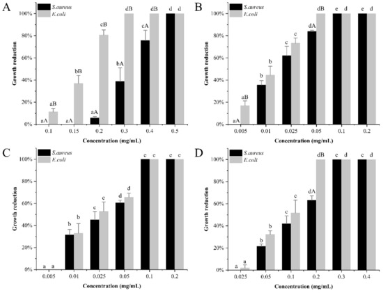 The growth reduction of E. coli and S. aureus treated with free thymol (A), functionalized HMSNs (B), MCM-41 (C), and AS (D). Different letters in the bars indicate statistically significant differences (p < 0.05) from concentrations (small letters) and microorganisms (capital letters) (n = 3).