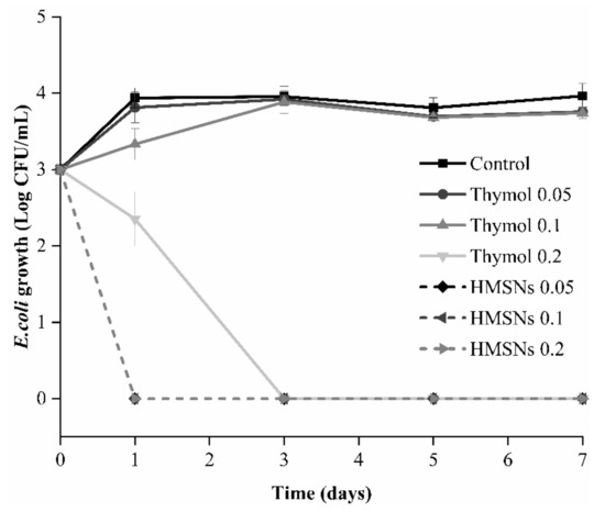 Apple juice has been always considered a low-risk food because of the low pH. However, the acid resistance of E. coli gives it the ability to survive in low temperatures and pH conditions, resulting in the outbreak of related foodborne diseases [2,46]. Therefore, the antimicrobial activity of different concentrations of functionalized HMSNs and free thymol against E. coli in the apple juice at 4 °C was evaluated and shown in Figure 7. The concentrations of HMSNs were based on the lowest three concentrations that could completely kill bacteria at 0.05 mg/mL, 0.1 mg/mL, and 0.2 mg/mL according to the previous results. The concentration of thymol was set to the same concentration as HMSNs and was used as a control. Compared with the control group, 0.05 mg/mL concentration of free thymol in the apple juice exhibited no inhibition effect. As the concentration increased, 0.1 mg/mL concentration of thymol showed a slight effect on E. coli in the first two days. At the concentration of 0.2 mg/mL, the growth of E. coli was partially inhibited on the 1 days and completely inhibited on the 3, 5, and 7 days. However, the functionalized HMSNs with equivalent concentrations of thymol completely inhibited the growth of E. coli at all concentrations for 7 days, which indicates that the excellent antibacterial ability of functionalized HMSNs was still maintained in a food system.