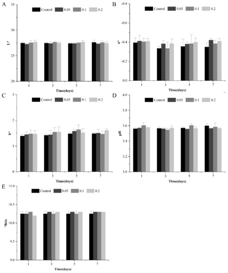 The color of apple juice treated with different concentrations of functionalized HMSNs was expressed by parameters (L, a, b) shown in Figure 8A–C. During 7 days of storage at 4 °C, the color of apple juice had little difference between treated and untreated juice. Similar results were obtained in pH and soluble solids of juice shown in Figure 8D,E, which indicated that physicochemical properties of apple juice were hardly influenced by functionalized silica particles. Peña-Gómez, Ruiz-Rico [46] used EOs- (eugenol and vanillin) functionalized silica particle as filtering aids to sterilize apple juice and evaluated the influence of the filtration process. Results showed that the treatment resulted in a slight change in the color and pH of the juice. These results are different from the current study, which can be attributed to the difference in processing methods and functional methods of the silica particle. Conversely, traditional thermal sterilization has been reported to significantly change the color and pH of juice during the thermal process, which will reduce consumer acceptance of fruit juices [47,48]. Therefore, EOs-functionalized silica particles as an alternative to thermal sterilization can effectively reduce the impact on the physicochemical properties of apple juice.