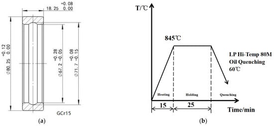 Bearings have already been an indispensable core component in many areas, such as aerospace, high-speed rail, and automotive. In practical application, bearings have been designed to withstand cyclical loads and resist external shocks. The purpose has provided an important guarantee for the high rotational accuracy and high wear resistance of many rotary machines at high speeds. Therefore, the service life and rotation accuracy of all rotating machinery has closely related to these characteristics of bearings. In the manufactured process of bearings, metallurgy, and the preparation of the material, the processing technology of materials, and heat-treatment technology have been the main factors that affected bearing performance []. Among them, the quenching process of the bearing ring has been very important to determine the final strength, wear resistance, rotation accuracy, and rotation noise performance of bearing rings, because the heat-treatment process of the bearing ring resembles close to the last process of bearing parts production [,].
