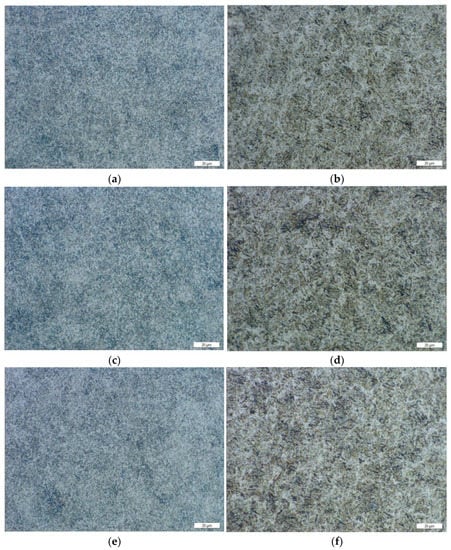 For the test sample inlay using acrylic resin cold inlay, the sample was mechanically ground, polished with a selected 2.5 µm diamond suspension, and polished for 3 min after 4% nitric acid alcohol corrosion. The organization of each surface before and after quenching is shown in Figure 2.