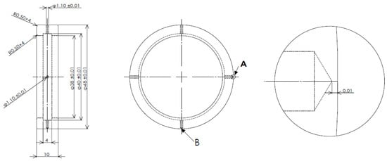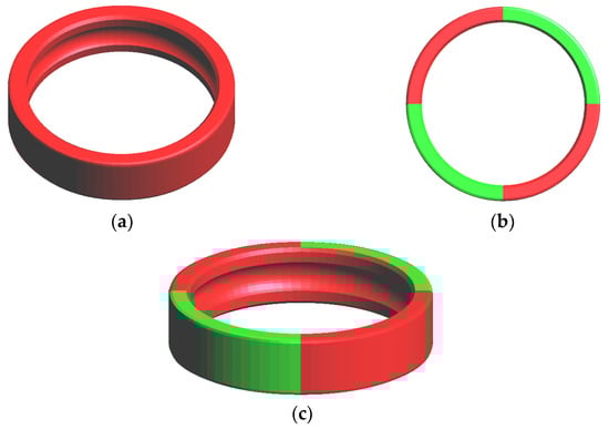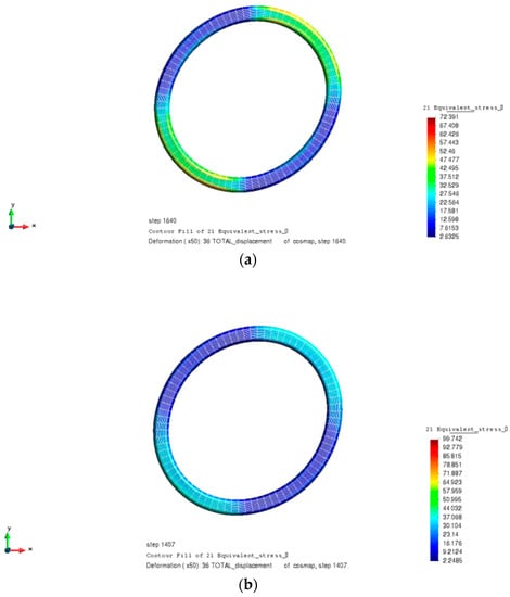 Table 6 shows that with applied orthogonal symmetrical heat transfer, the ellipticity was 0.14 mm, and with applied external orthogonal symmetrical and internal axial symmetry heat transfer, the ellipticity was 0.158 mm. Because the former for the newly added boundary conditions resulted in a residual stress value of about 42 MPa, while the latter, due to the internal surface still maintained axial symmetry, the newly added boundary conditions are only applied to the external surface of the bearing outer ring; therefore, the residual stress value is about 30 MPa. The residual stress value on the circumferential surface is different, causing an ellipse of the bearing outer ring. The analysis of the temperature cooling curves mentions the size of the area where the curves cross as a possible reason for the value of ellipticity, and thus, here it was also confirmed.